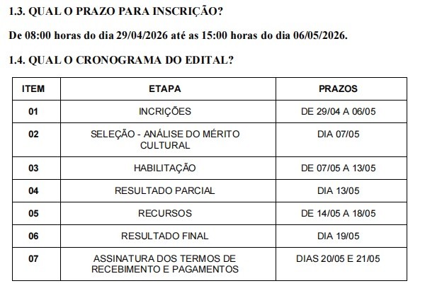 De acordo com o cronograma oficial, as inscrições estarão abertas no período de 29 de abril a 06 de maio. O resultado preliminar será divulgado no dia 13 de maio, seguido pelo período de interposição de recursos entre os dias 14 e 18 de maio. O resultado final está previsto para o dia 19 de maio.